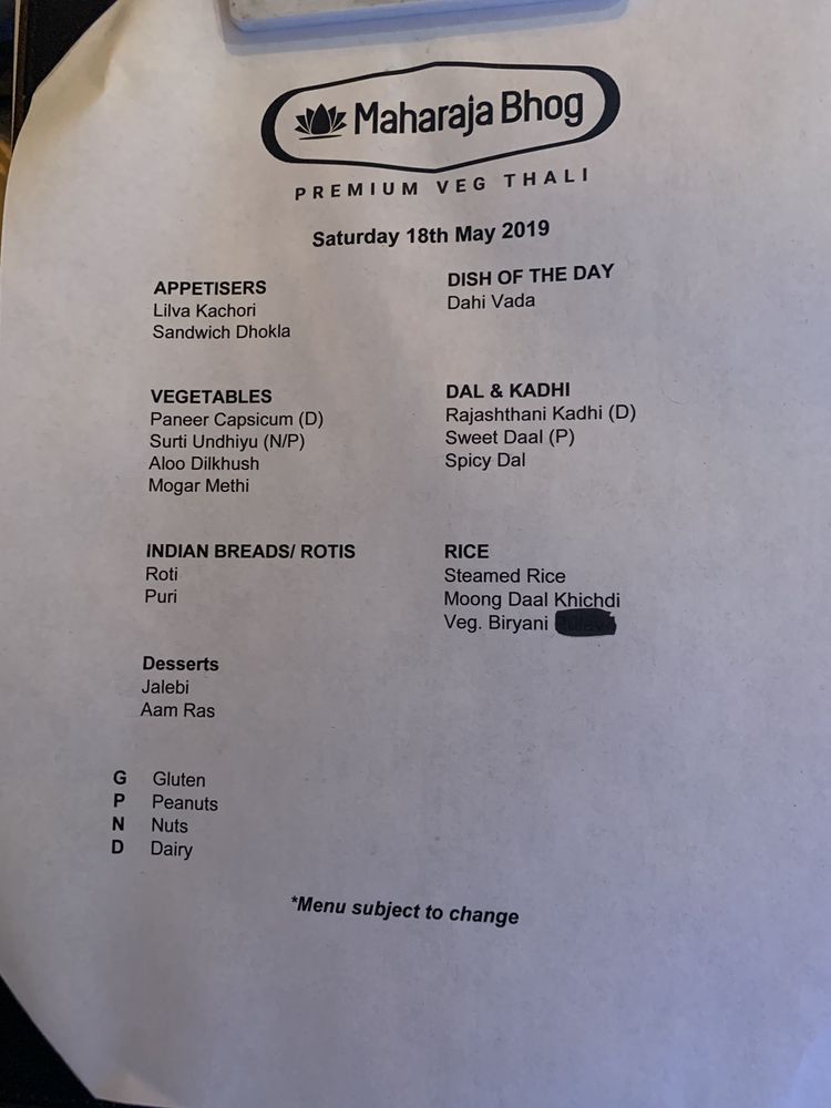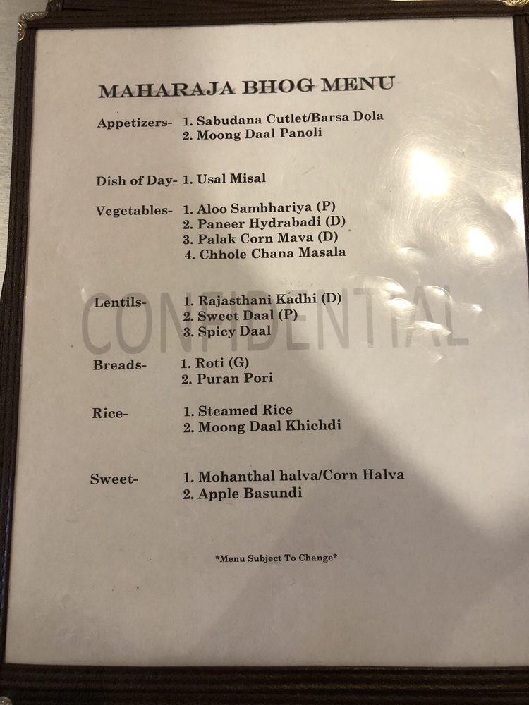 Dish of the Day (Daal Pakwan ), Appetizers (Makai Marble, Palak Dhokla ), Vegetables (Paneer Corn Capsicum, Tindola Achari, Aloo Lasuniya, Chawali Saucewala ), Lentil Soups (Spicy Daal, Sweet Daal, Rajasthani Kadhi), Rice (Steam Rice, Moong Daal Khichdi), Sweet (DUdhi Halva, Shrikahnad ), Types of Bread ( Roti & Puran Poli ), Ketchup, Pickle, Papad- Dish of the Day ONLY for Dinner