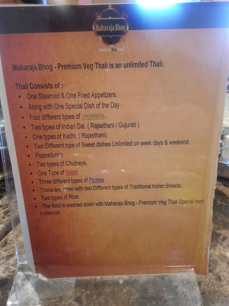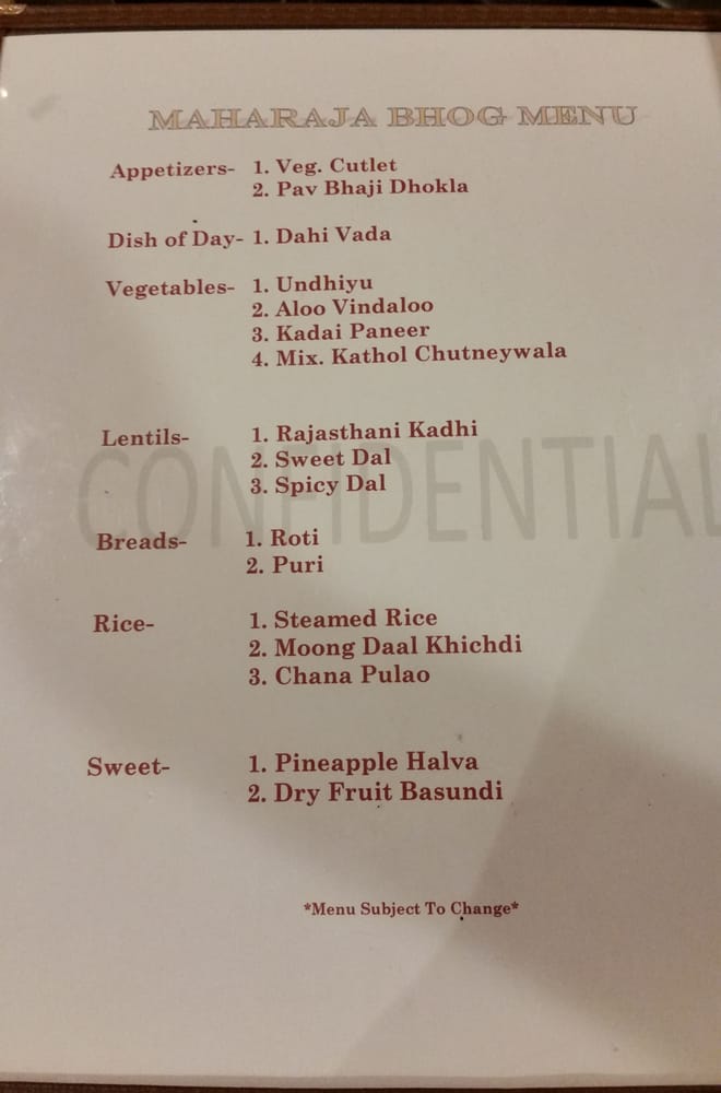 Appetizers (Hing Kachori, Dudhi Muthiya ), Vegetables (Paneer Butter Masala, Baingan Bharatha, Aloo Tomato Rasawala, Rangooni Val Rajwadi ), Lentil Soup (Spicy Dal, Sweet Dal, Rajasthani Kadhi), Rice (Steamed Rice, Moong Dal Khichdi), Sweet (Mohanthal Halva, Dryfruit Carrot Kheer ), Type of Bread ( Roti), Ketchup, Pickle & Papad